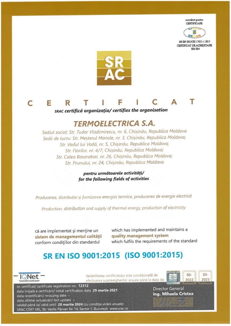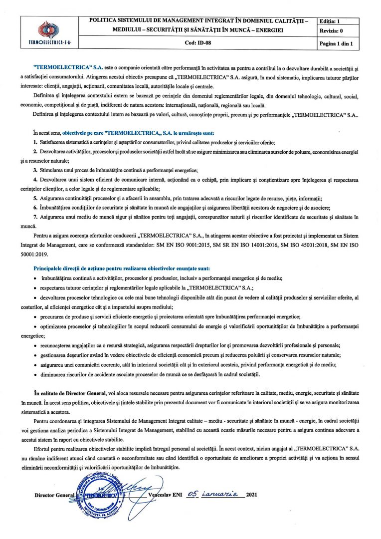 Интегрированная система Менеджмента, внедренная «Termoelectrica » S.A., объединяет в единую систему требования стандартов: