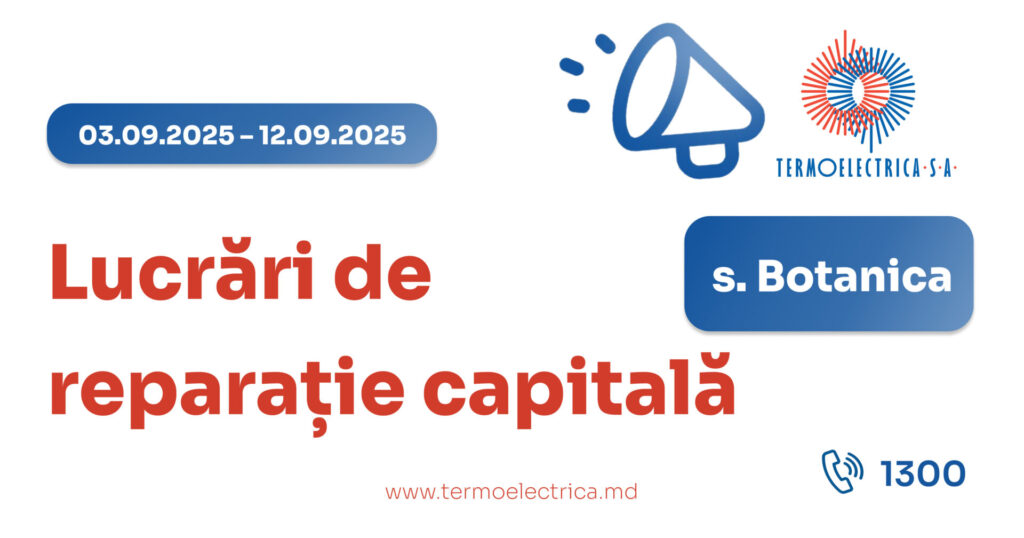 „Termoelectrica” S.A. informează consumatorii din sectorul Botanica despre executarea lucrărilor planificate de reparație capitală a utilajului termotehnic. Aceste intervenții sunt esențiale pentru buna funcționare și siguranța sistemului centralizat de termoficare în sezonul rece 2025–2026.